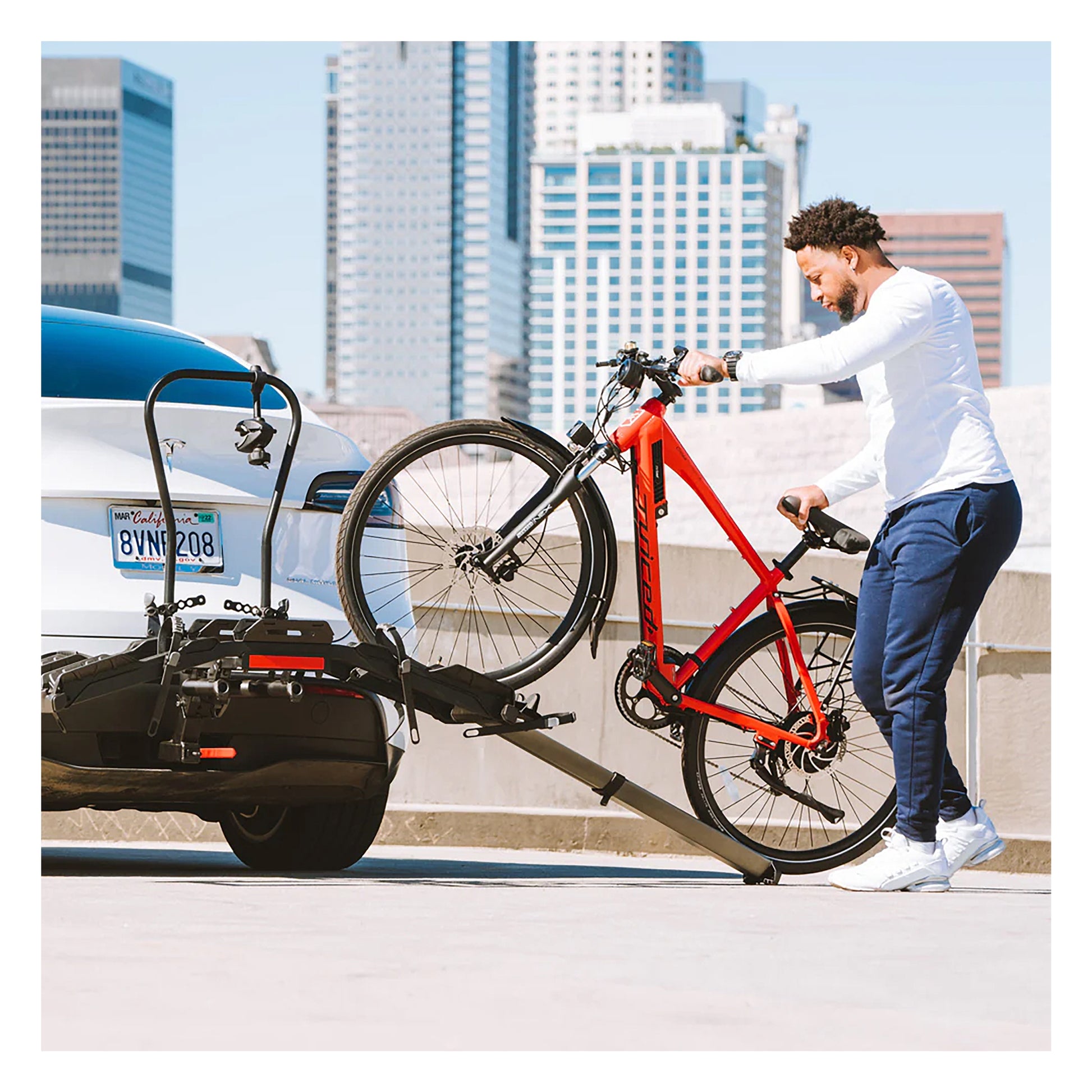 The Destination E for Electric Bikes is our new hitch bike rack designed specifically to carry electric bikes with any sized tire up to 4.5" wide. This new bike rack has a sleek and modern design and can carry up to two 70 lb. electric bikes or standard bikes. It includes an expandable, wide aluminum ramp so you can load and unload your bikes easily. The Destination E hitch-mounted bike rack can fold flat against the car when not in use and features "balanced tilting" where the pivot point is between the bikes for easy trunk access when the bikes are loaded.