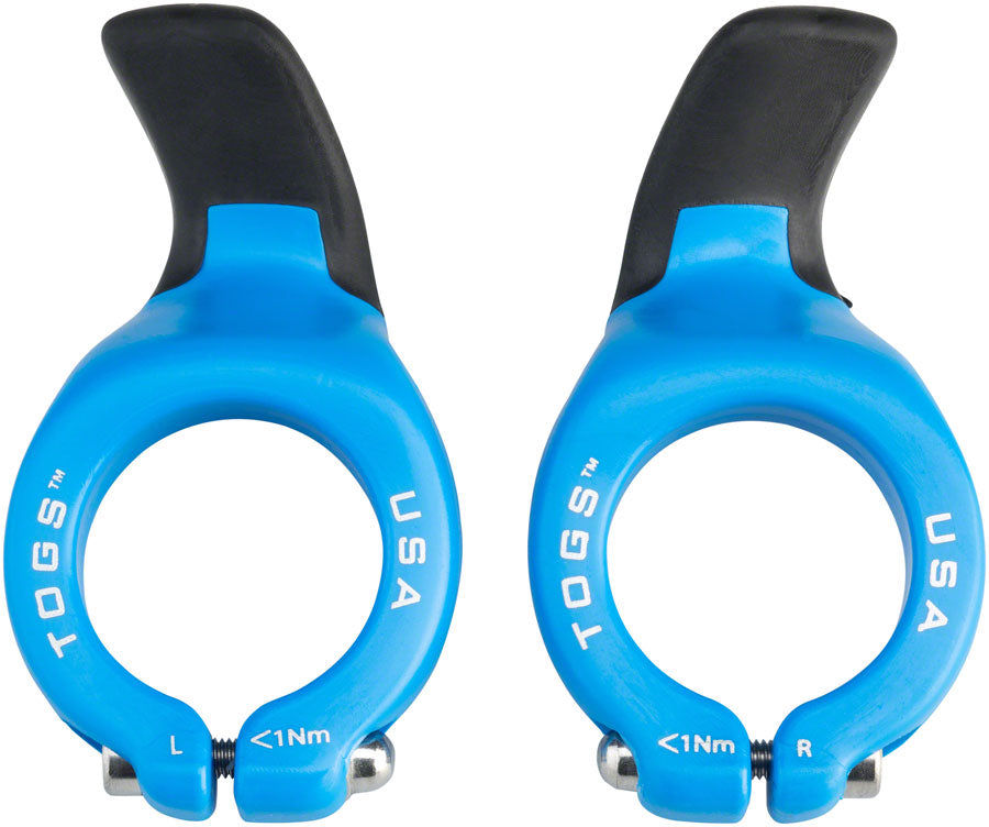 Togs are great for commuters, recreational bikers and racers alike. They fit nearly all handlebars and grips, including lock-on grips. TOgs add a control point to the top of the bar. Control the bar with your thumbs and conveniently index shift and brake from the Togs position.Togs give your hands and wrists a change of position. This means less wrist flexing and hand clenching, making an overall happier ride. Great for hand issues.