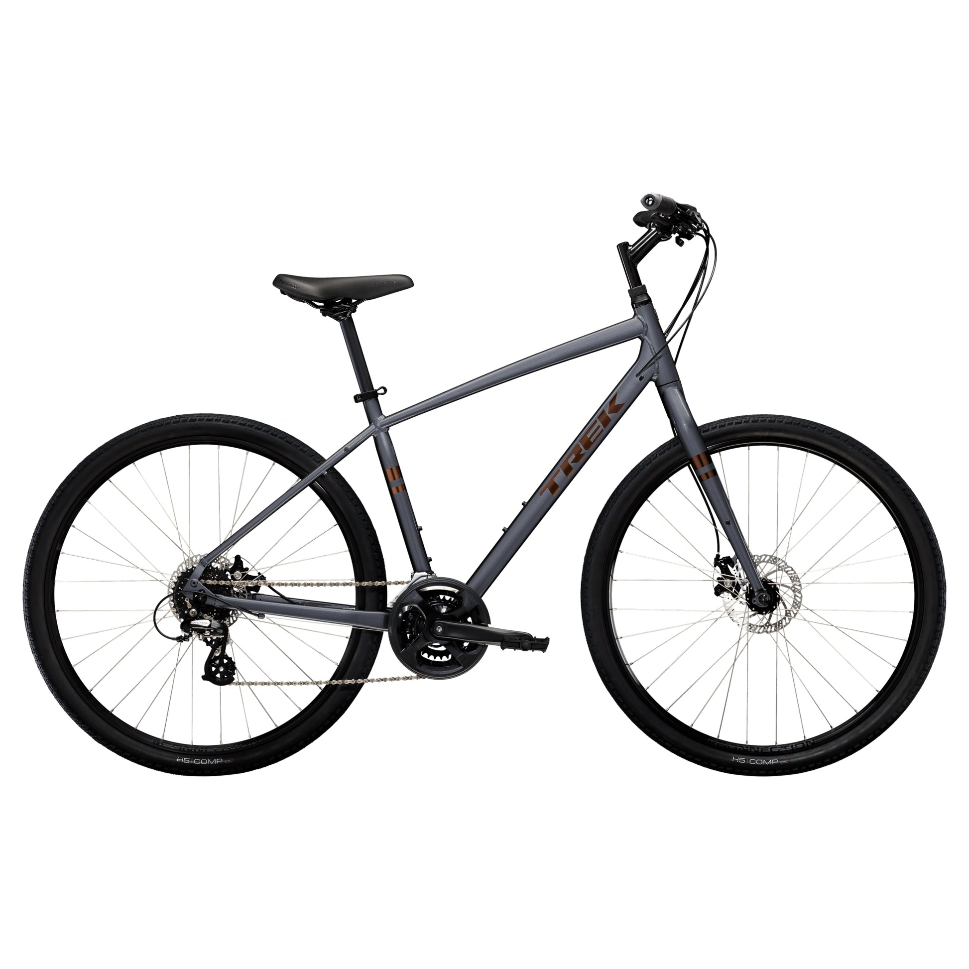 A lightweight aluminum frame with mounts for a rack and fenders, 16 speeds to help you conquer varied terrain, ergonomic grips, a Bontrager padded saddle, wider 45c tires for added stability, powerful disc brakes, and a geometry that keeps you in a comfortable, upright riding posture.